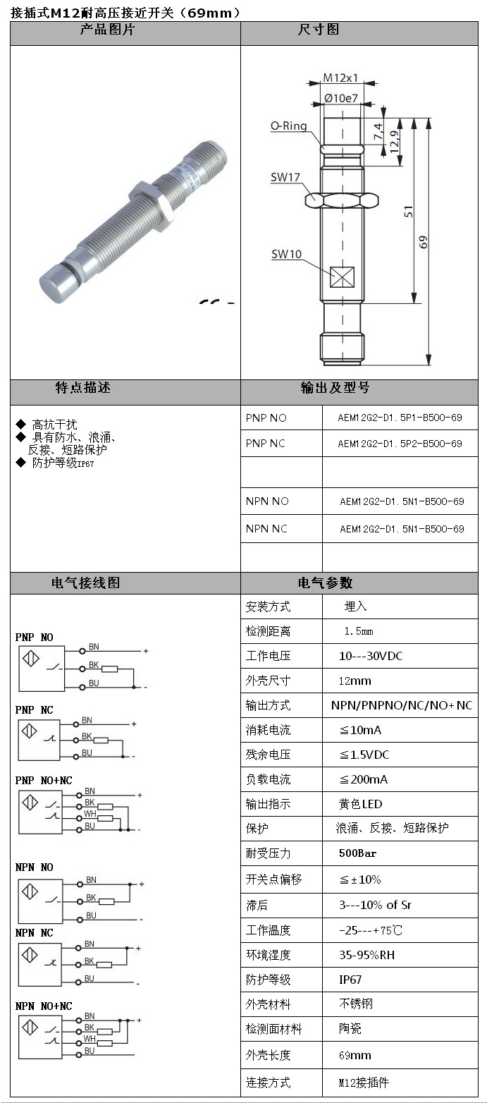 AEM12G2-D1.5P1-B500-69,AEM12G2-D1.5P2-B500-69,AEM12G2-D1.5N1-B500-69,M12接插式(69mm)
