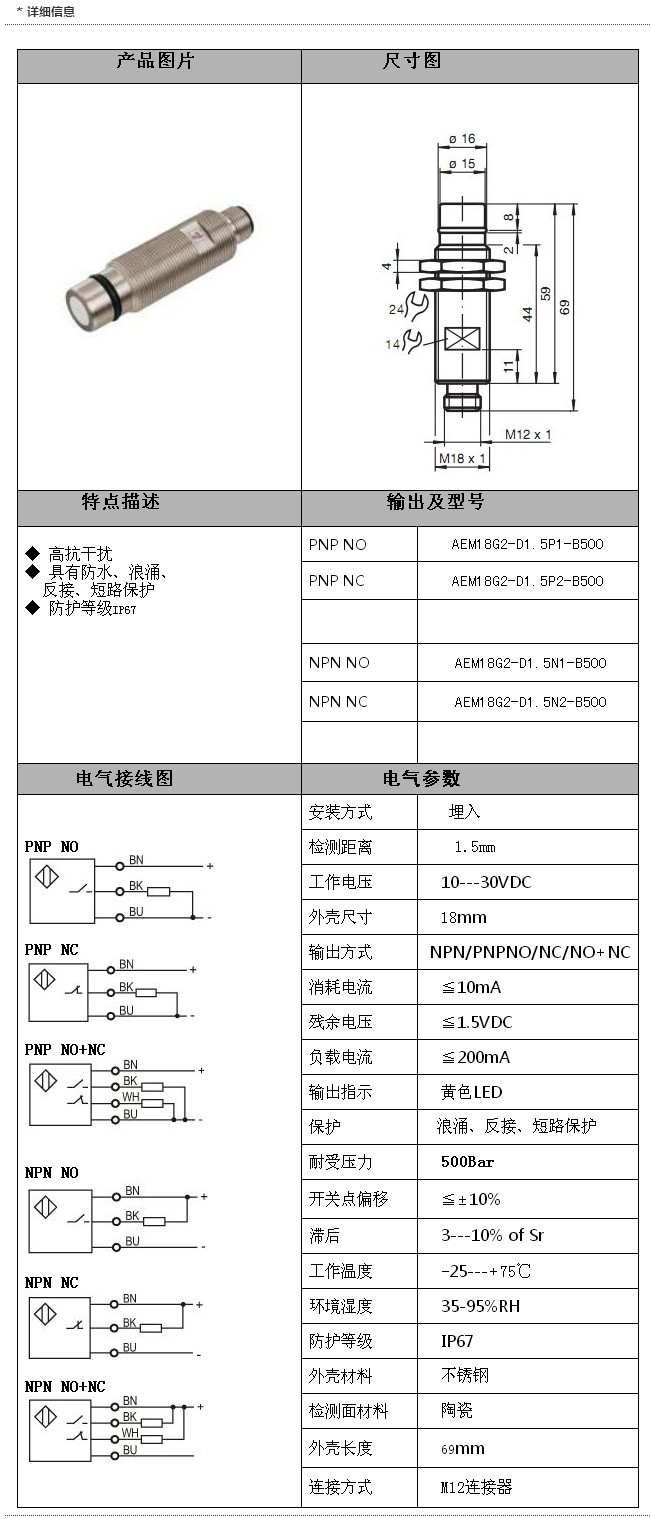 詳細信息 AEM18G2-D1.5P1-B500,AEM18G2-D1.5P2-B500,AEM18G2-D1.5N2-B500,接插式M18耐高壓傳感器