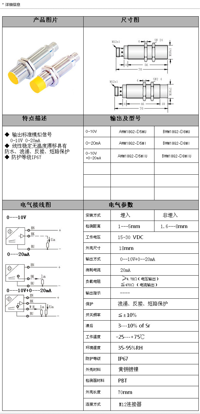 詳細信息 AWM18G2-D5MU,BWM18G2-D8MU,AWM18G2-D5MI,AWM18G2-D5MIU,BWM18G2-D8MIU,接插式M18模擬量傳感器