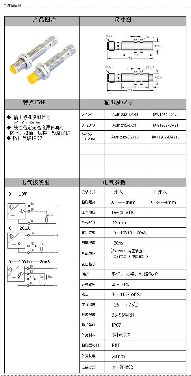 詳細信息 AWM12G2-D2MU,BWM12G2-D4MU,AWM12G2-D2MI,AWM12G2-D2MIU,BWM12G2-D4MIU,接插式M12模擬量傳感器