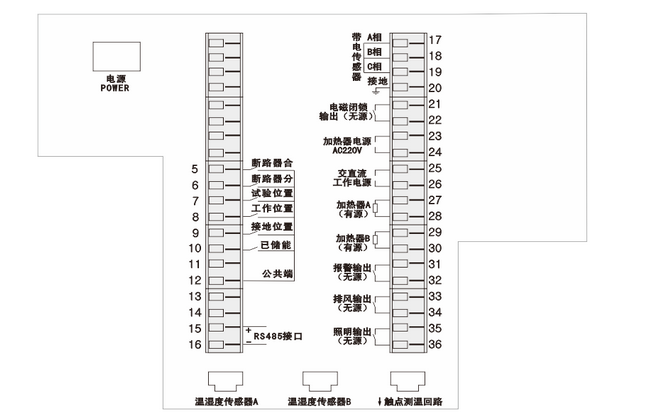 4、高壓帶電指示器的各輸入端分別接入對應(yīng)的高壓帶電傳感器,高壓帶 電指示燈亮,閉鎖有效,閉鎖燈滅;高壓斷開后,帶電指示燈滅,閉鎖接觸,指示燈亮。在MT-ZT140系列產(chǎn)品中,三相(A、B、C)任意一相帶電對應(yīng)的指示 燈亮,閉鎖觸點有效。