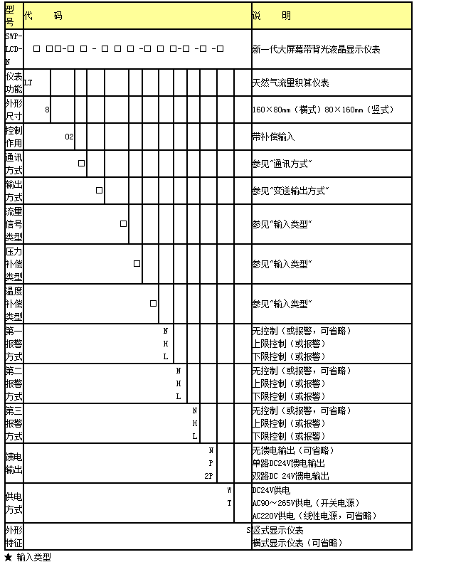 SWP-LCD-NLT(智能)天然氣流量顯示積算控制儀適用于在線測(cè)量天然氣的流量,將管道中的天然氣流量經(jīng)補(bǔ)償、計(jì)算自動(dòng)換算為工業(yè)標(biāo)準(zhǔn)狀態(tài)下的天然氣體積流量和積算量。