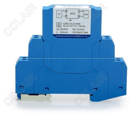 5V信號(hào)SPD,四線制,本安型,適用于線對(duì)地隔離電壓>500V信號(hào)回路,最大放電電流Imax(8/20us):20kA/線,12.5mm超薄,通過(guò)DIN35金屬導(dǎo)軌接地。