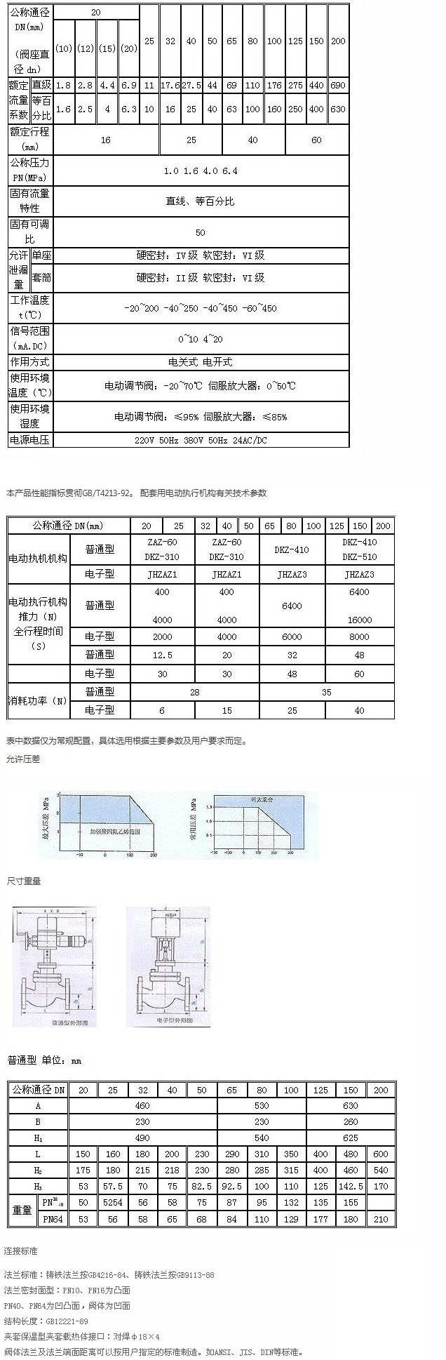 本系列產(chǎn)品公稱通徑由20至200mm,公稱壓力有1.0、1.6、4.0、6.4MPa,使用溫度范圍由-40℃~450℃,接受信號為0~10mA.DC或4~20mA.DC。其中電動單座調(diào)節(jié)閥適用于壓差較小,介質(zhì)粘度較大或稍有顆粒雜質(zhì)場合。電動套筒調(diào)節(jié)閥適用于壓差較大場合。按閥內(nèi)件密封部分材質(zhì)分又有金屬-金屬和非金屬-金屬密封兩種,后者閥關(guān)閉時泄漏量可達VI級(零泄漏)標準。按填料不同可分為一般填料密封和波紋管密封兩種,前者用一般場合,而后者用至不允許外漏的重要場合。流量特性為線性或等百分比。配用不同的執(zhí)行機構(gòu)可分為普通型和電子型兩種。多種多樣的品種規(guī)??晒┻x擇。