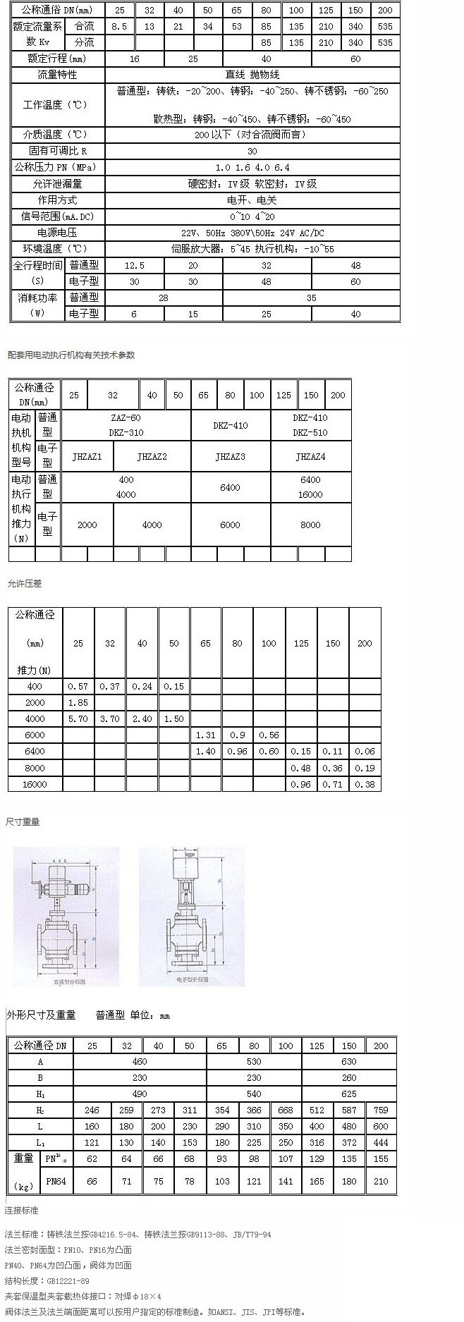 本系列產(chǎn)品口徑由25mm至200mm,公稱壓力有1.0、1.6、4.0、6.4MPa,溫度范圍-60℃至450℃,控制信號(hào)為0~10或4~20mA.DC。配用不同的執(zhí)行機(jī)構(gòu)可分為普通型和電子型兩種。