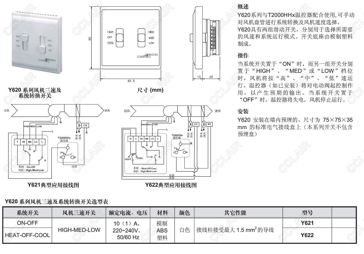 Y621,Y622,Y620,風(fēng)機(jī)三速及系統(tǒng)轉(zhuǎn)換開關(guān)