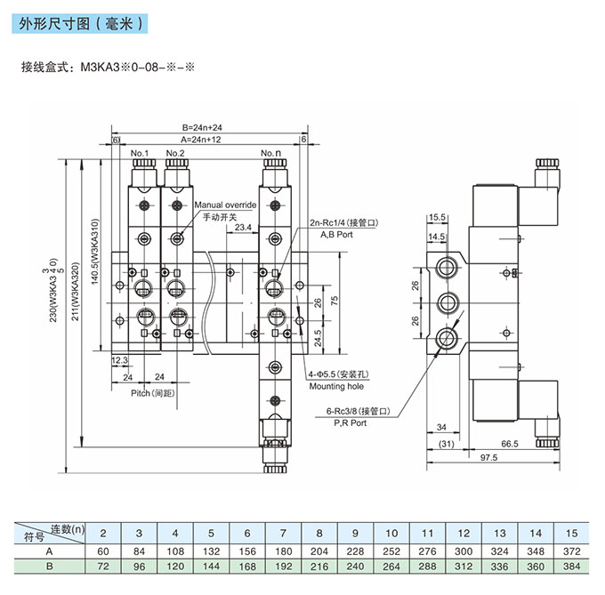 M3KA310-08,M3KA320-08,M3KA330-08,M3KA340-08,M3KA350-08,M3KA380-08,M3KA310-08-B,先導(dǎo)式5通匯流板型電磁閥