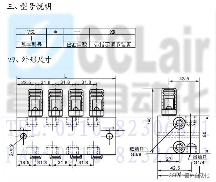 VSL-KR型雙線分配器上下面均有給油口,分配器活塞正反向動作時分別從上面和下面的給油口排出潤滑脂;在相應(yīng)上、下給油口內(nèi)設(shè)有合二為一的排油結(jié)構(gòu),要改變奇數(shù)出油,只需將孔內(nèi)的螺釘擰出即可。還可以從指示桿的動作直接觀察分配器的工作情況,同時還可以通過調(diào)整螺釘在規(guī)定范圍內(nèi)調(diào)整各出油口的給油量。