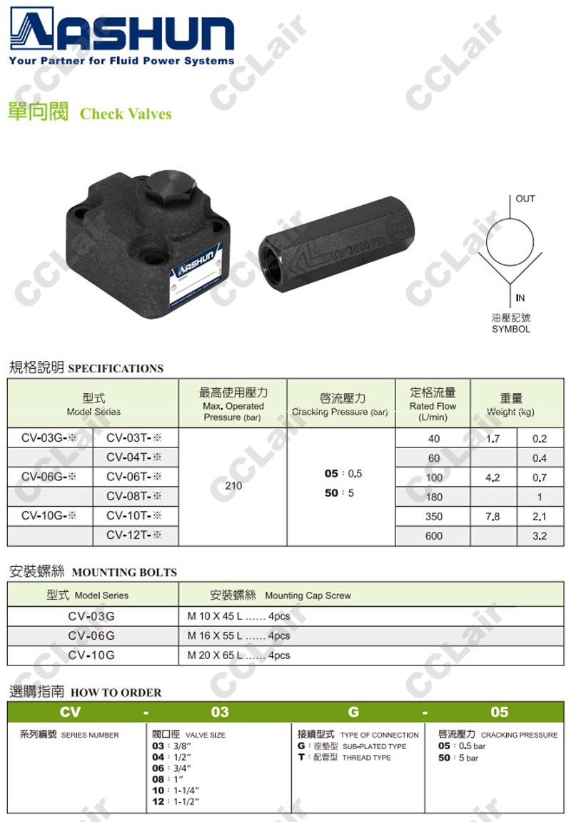 CV-03,CV-04,CV-06,CV-08,CV-10,CV-12,CV-03G-05,CV-06T-50,CV-10T-05,CV-12G-50,ASHUN油順單向閥