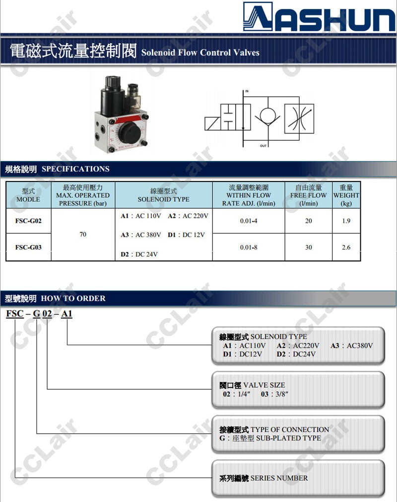 FSC-G02,FSC-G03,FSC-G02-A1,FSC-G02-D2,FSC-G03-A3,FSC-G03-A2,ASHUN油順電磁式流量控制閥