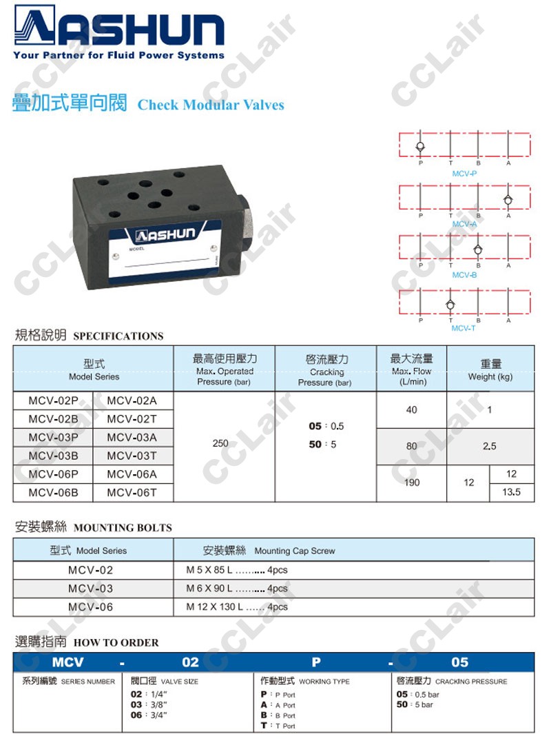 MCV-02,MCV-03,MCV-06,MCV-02P-05,MCV-03A-50,MCV-06B-50,MCV-06T-05,ASHUN油順疊加式單向閥