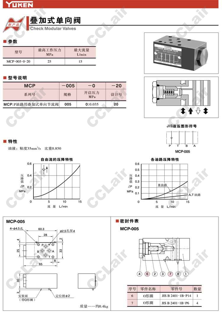 MCP-005-0-20,疊加式單向閥,YUCIYUKEN榆次油研