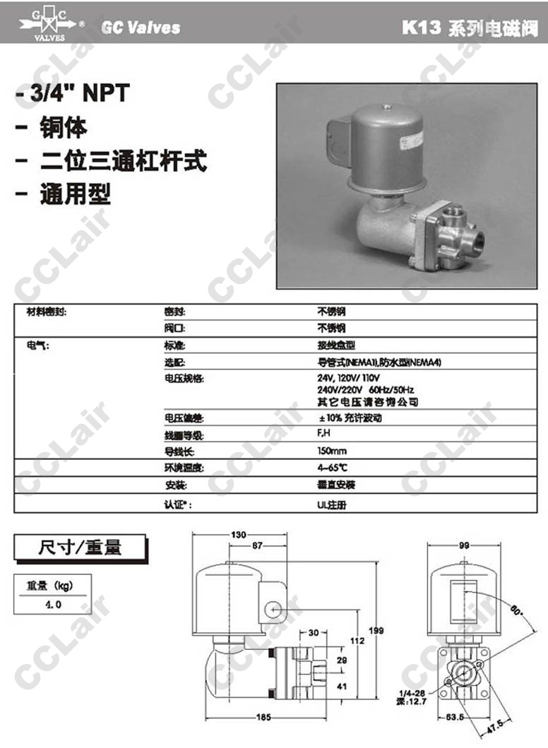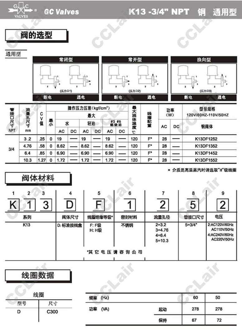 詳細信息 K13DF1252,K13DF1352,K13DF1452,K13DF1552,GC Valves二位三通杠桿式電磁閥