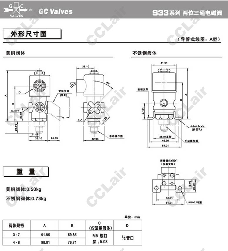 詳細信息 S333GF02C,S334GF02C,S336GF02C,S336GF02C3BD5,S336GF02C4BD8,S336GF02C4BC9,GC Valves二位三通直動式電磁閥