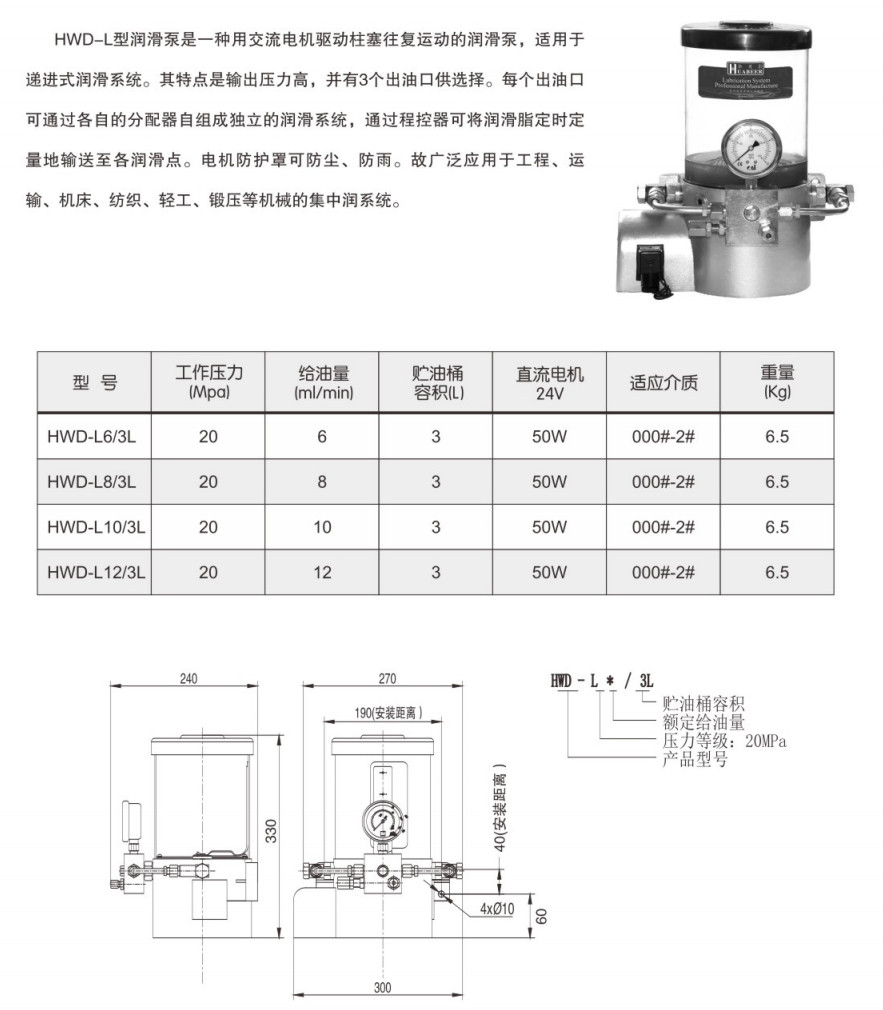 HWD-L6/3L,HWD-L8/3L,HWD-L10/3L,HWD-L12/3L,電動潤滑泵 詳細信息 HWD-L6/3L,HWD-L8/3L,HWD-L10/3L,HWD-L12/3L,電動潤滑泵