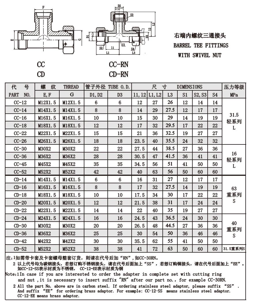 CC-12,CC-26,CC-30,CC-36,CC-45,CC-52,CD-36,CD-42,CD-52,內(nèi)螺紋三通接頭