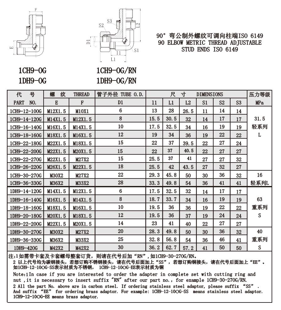 1CH9-12-12-100G,1CH9-22-22-180G,1CH9-30-30-270G,1DH9-36-36-330G,1DH9-420G,公制螺紋卡套接頭