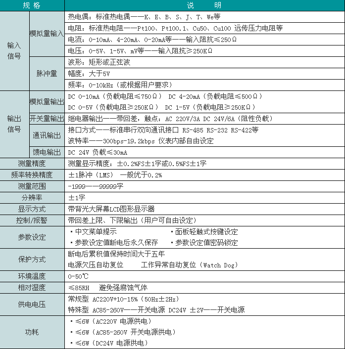 本表所列為最大量程,用戶(hù)可在量程范圍內(nèi)通過(guò)修改儀表二級(jí)參數(shù)確定量程范圍