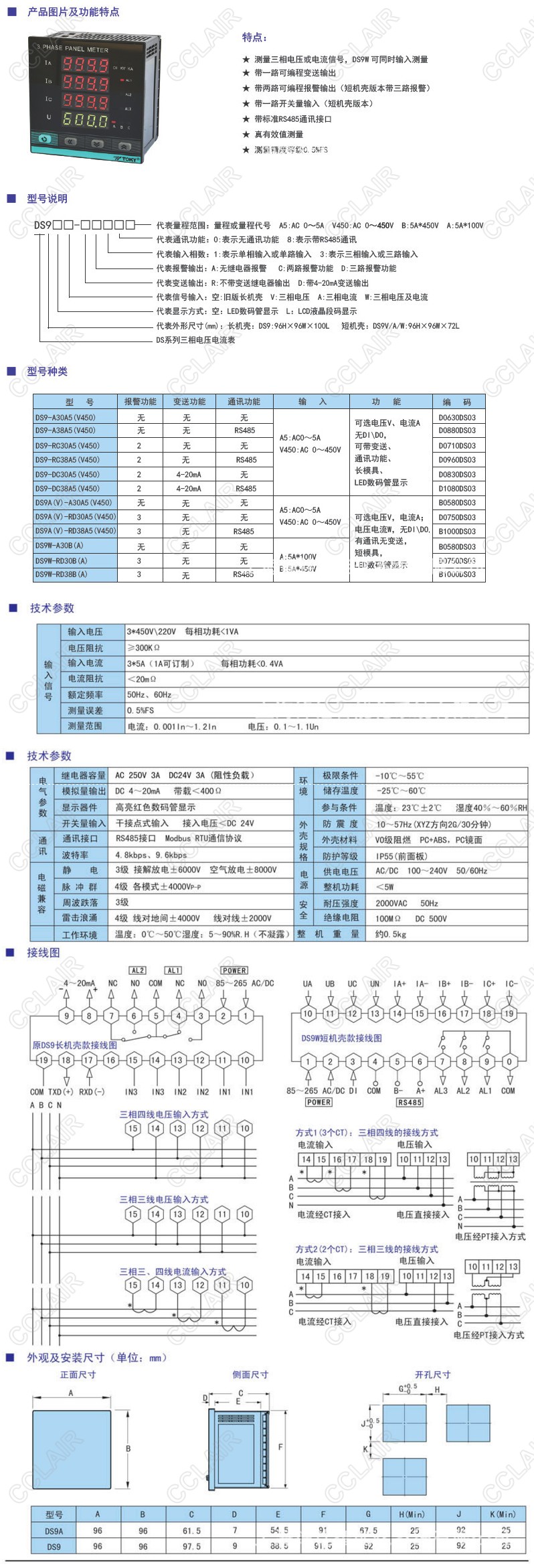 DS9-DC38V450,DS9-RC38V450,DS9-RC30V450,DS9-DC38A5,DS9-RC38A5,DS9-RC30A5,DS9-C長模具三相電壓電流測量表