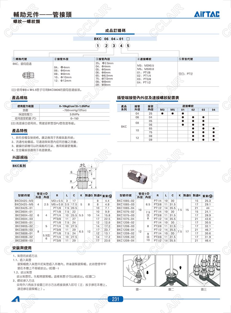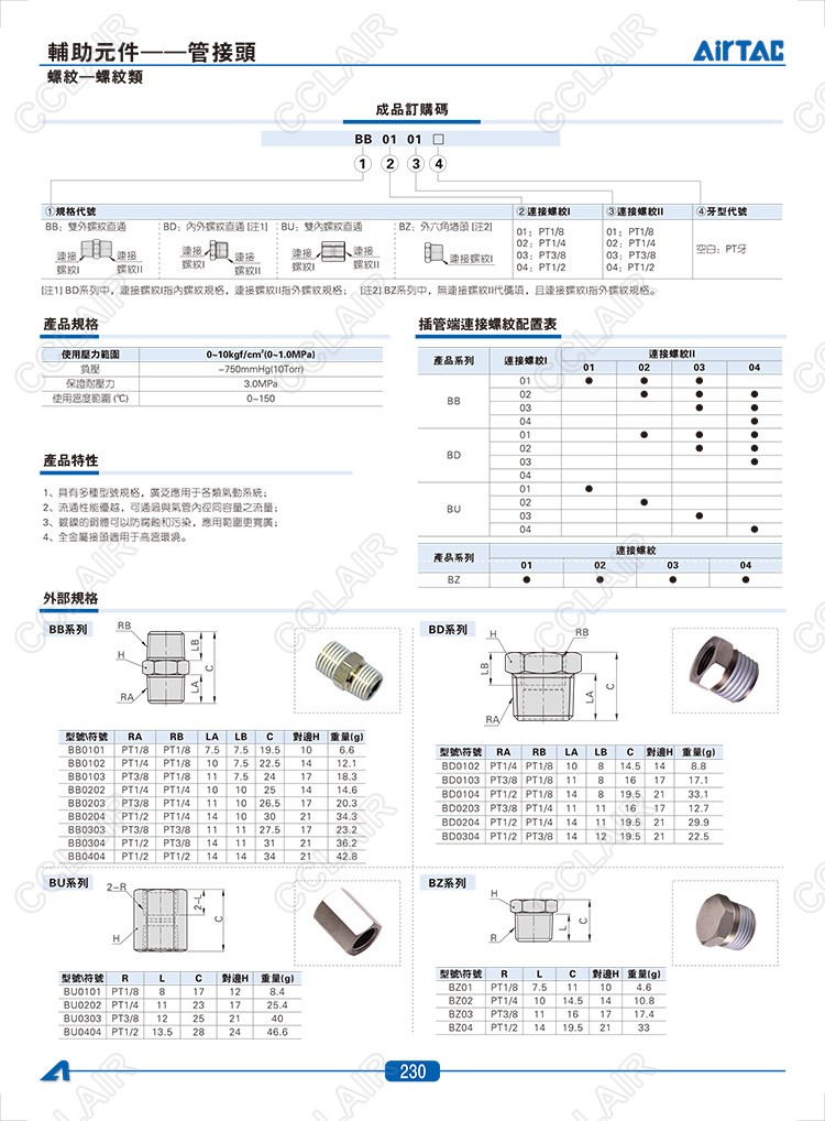 BB0101,BB0102,BD0102,BD0103,BU0101,BU0202,BZ01,BZ02,AIRTAC管接頭