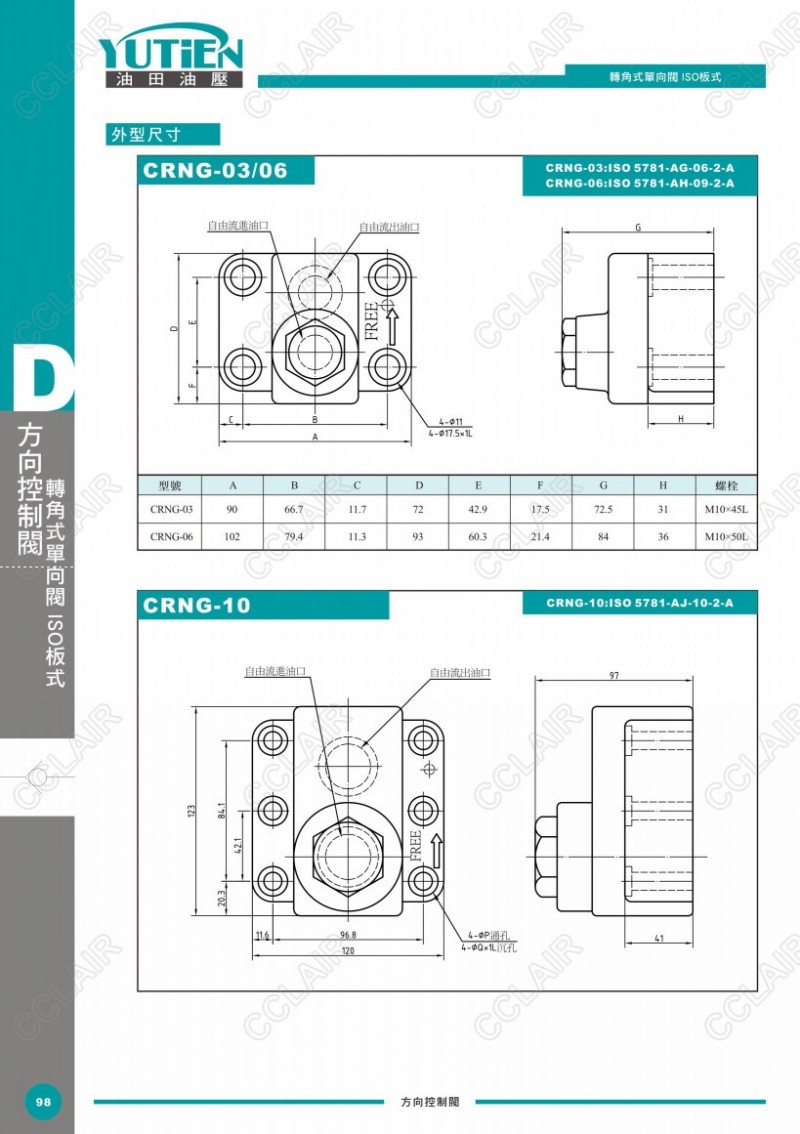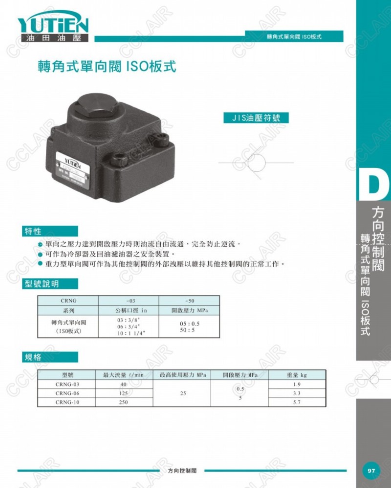 YUTIEN油田轉(zhuǎn)角式單向閥CRNG-03-05,CRNG-03-50,CRNG-06-05,CRNG-06-50,CRNG-10-05,CRNG-10-50
