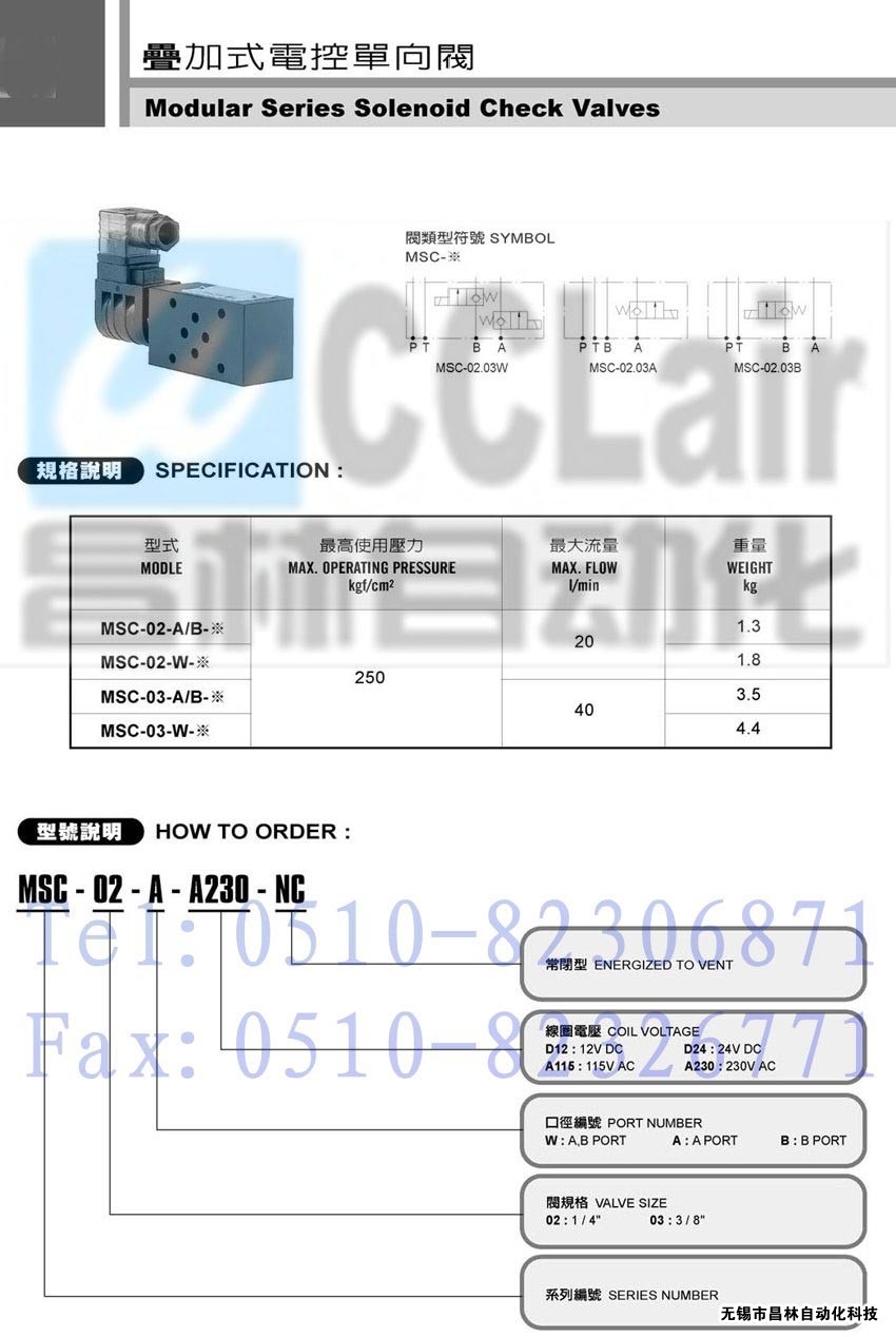 MSC-02-W-A230-NC, | 疊加式電控單向閥 | |