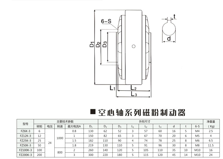 FZ6K-3,FZ12K-3,FZ25K-3,FZ50K-3,FZ100K-3,FZ200K-3,空心軸磁粉制動(dòng)器