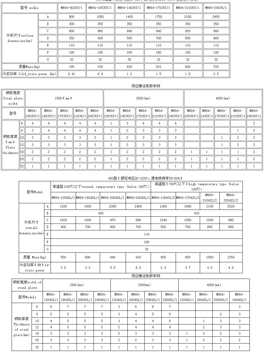 本系列產(chǎn)品是專為吊運(yùn)中厚鋼板而設(shè)計(jì)的。吊運(yùn)作業(yè)安全準(zhǔn)確迅速。考慮到長(zhǎng)鋼板吊運(yùn)可能出現(xiàn)彎曲變形而影響安全搬運(yùn),所以在吊運(yùn)長(zhǎng)尺寸鋼板時(shí),請(qǐng)使用多臺(tái)電磁鐵聯(lián)用。對(duì)于中厚板(6mm-32mm)電磁鐵的間距多取3-4米,兩端外伸部分的長(zhǎng)度可取間距的二分之一。根據(jù)吊運(yùn)張數(shù)的不同,又分為350型和400型兩類。350型適合于中厚板長(zhǎng)、造船廠、機(jī)械制造廠,采用調(diào)磁控制方式,能起吊一張或一定張數(shù)鋼板。400型適用于一次搬運(yùn)盡量多的張數(shù),可根據(jù)用戶要求另行設(shè)計(jì)制造吊運(yùn)700℃一下鋼板用高溫型產(chǎn)品。