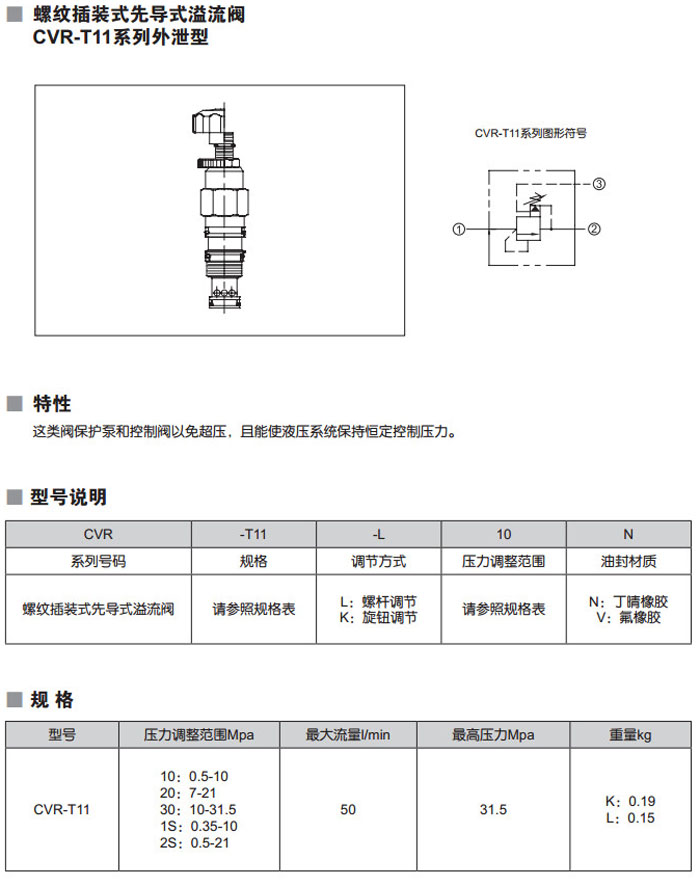 CVR-T11-L10N,CVR-T11-K10N,CVR-T11-L20N,CVR-T11-L30N,CVR-T11-L1SN,CVR-T11-L2SN,螺紋插裝式先導(dǎo)式溢流閥