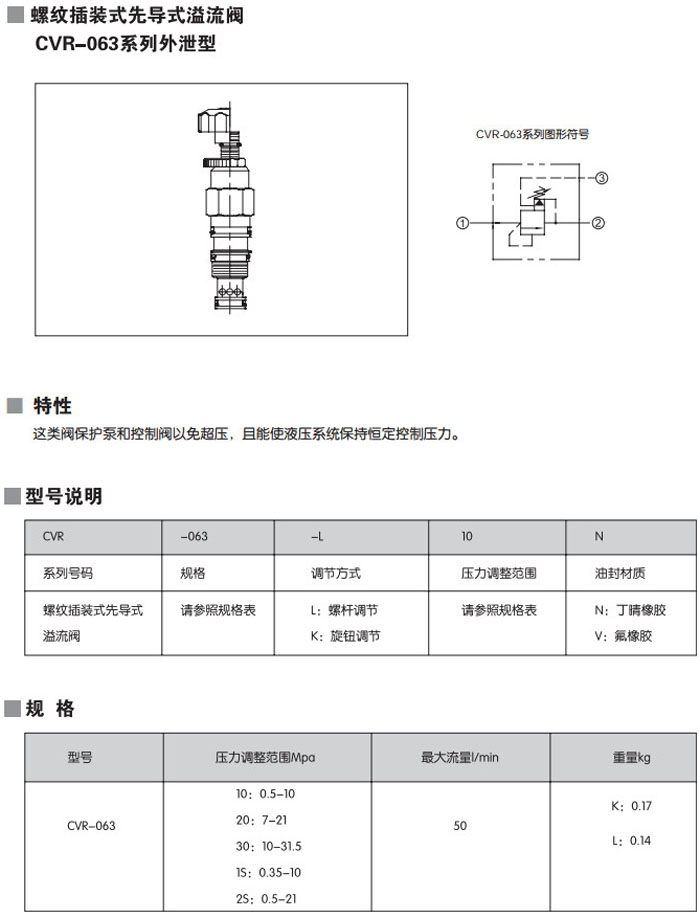 CVR-063-L10N,CVR-063-K10N,CVR-063-L20N,CVR-063-L30N,CVR-063-L1SN,CVR-063-L2SN,螺紋插裝式先導(dǎo)式溢流閥
