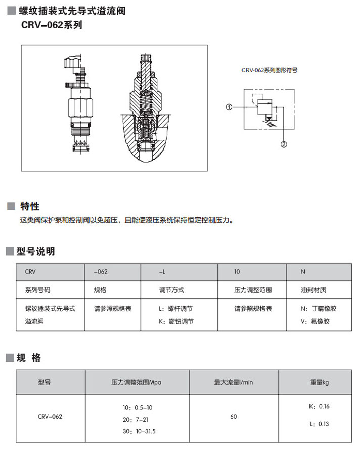 CRV-062-L10N,CRV-062-L20N,CRV-062-L30N,CRV-062-K10N,CRV-062-K20N,CRV-062-K30N,螺紋插裝式先導(dǎo)式溢流閥
