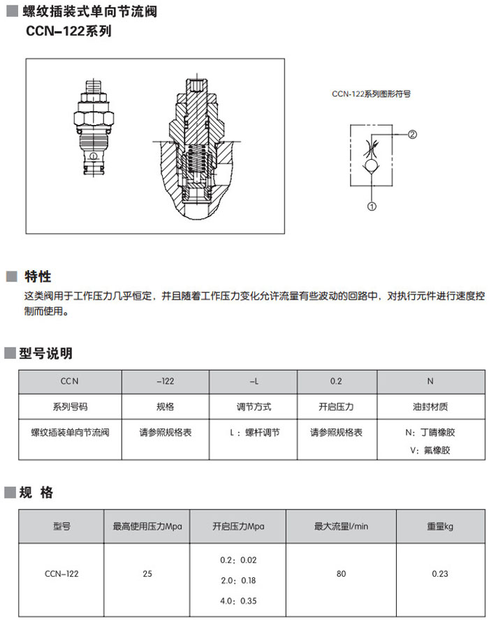 CCN-122-L0.2N,CCN-122-L2.0N,CCN-122-L4.0N,CCN-122-L0.2V,CCN-122-L2.0V,CCN-122-L4.0V,螺紋插裝式單向節(jié)流閥